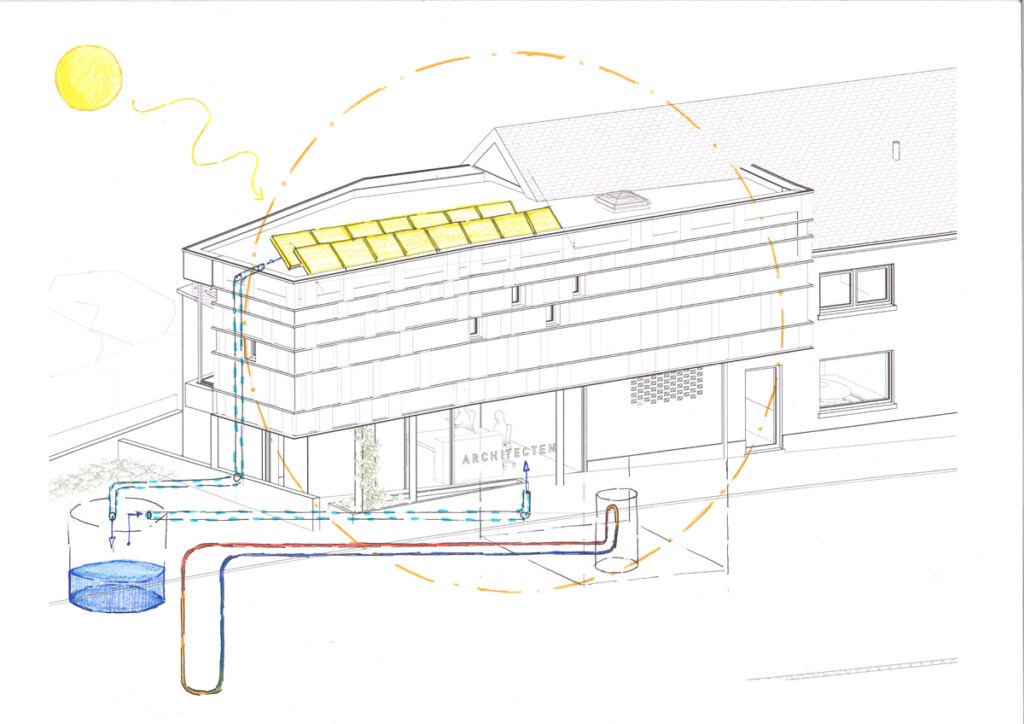 De sterk verlaagde energievraag van het project wordt opgevangen door hernieuwbare energiebronnen zoals zonnepanelen en een geothermische warmtepomp voor verwarming en passieve koeling. Deze technieken worden automatisch gestuurd door het Loxone-systeem waardoor de energie-efficiënte van de hernieuwbare bronnen verhoogd zal worden. Het kantoor kreeg een Quooker kraan zodat er eindeloos gekoeld en gefilterd water voorhanden is. Een regenwateropvangsysteem met herbruik van de oude waterput als infiltratieput ondersteunt de natuurlijke watercyclus. De vermindering aan verharde oppervlakte, waterpasserende klinkers of grasdallen maar ook een vaste luifel boven de zuidelijk georiënteerde ramen waarop wijnranken zullen groeien, de begroening van de houten gevel aan straatzijde en een mooie intensieve daktuin zorgen dat natuur de niet bebouwde maar ook de bebouwde ruimte kan heroveren. Het groen zorgt uiteraard voor een verlaging van de omgevingstemperatuur ten opzichte van de origineel bijna volledig verharde ruimte. Om de biodiversiteit rondom de groene daken en gevels te verhogen wordt er intensief ingezet op ruimte voor fauna en flora. De voor- en zijgevel op de 1ste verdieping worden voorzien van vogelkastjes op verschillende hoogtes zodat zwarte roodstaart, roodborstje, mussen, gierzwaluwen en pimpel/koolmeesjes plaats vinden om hun nestje te bouwen. Rondom het project worden diverse bloemenborders aangelegd. Naast het terras achteraan zal een wadi een verkoelend effect creëren waarbij oppervlaktewater kan infiltreren in de bodem.
