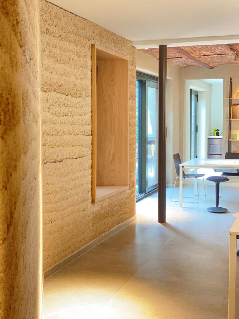Voor de nieuwe wanden op de verdieping werden kalkhennepblokken gebruikt. Met het Hempro-systeem van ISOHEMP werden kalkhennepblokken met een negatieve CO2impact, van -75kg CO2 per m3, hebben. Bovendien hebben kalkhennepblokken meerdere voordelen ten opzichte van traditionele bouwmaterialen. Kalkhennep is een natuurlijk product, 100% recycleerbaar, onbrandbaar met een uitzonderlijk goed vochtregulerend karakter. Kalkhennep heeft een lange thermische faseverschuiving waardoor warmte in de zomer lang buiten blijft en koude in de winter moeilijk kan binnendringen. De kalkhennepblok zorgt voor een aangenaam, ademend en gezond binnenklimaat met een hoog thermisch comfort waardoor minder behoefte is aan verwarming en koeling dewelke de energie-efficiëntie aanzienlijk verhoogt.