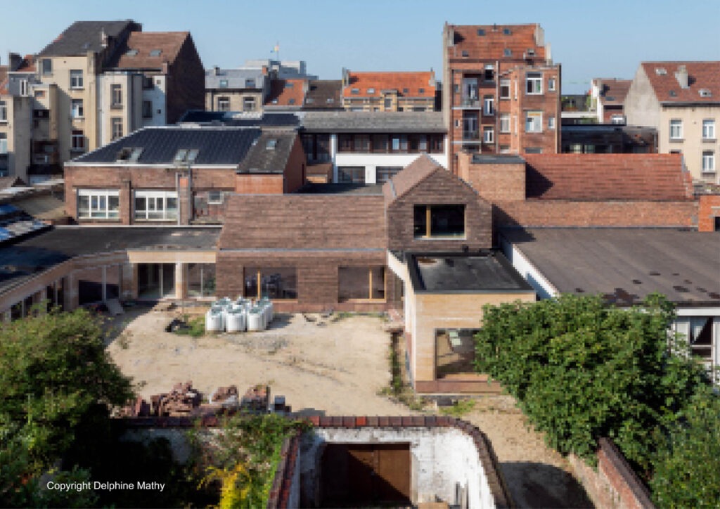 Le projet GROW transforme un ancien îlot minéralisé en un espace végétalisé, convivial et durable, réunissant bureaux, salle polyvalente et aménagements paysagers, dans une démarche fondée sur le réemploi, la durabilité et la biodiversité.