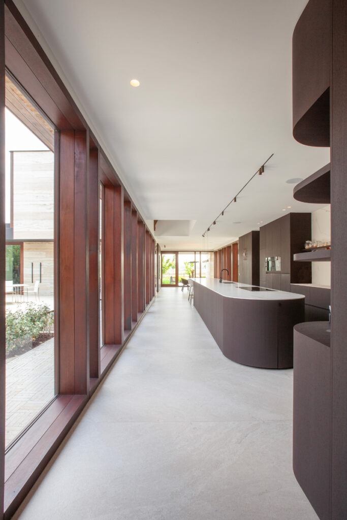 De grote ramen in de achtergevel geven een ongehinderd uitzicht op de achterliggende weilanden. Op de verdieping begeleidt een groendak op het overdekt terras het natuurlijke uitzicht.