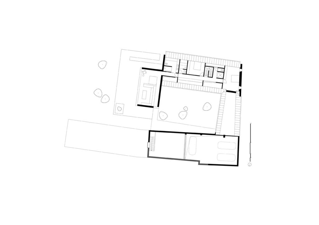 De natuursteen geeft ook het terras vorm. De hoeken zijn daarbij niet afgesneden, wat de openheid naar het landschap versterkt. Het terras definieert het grondplan van de nieuwbouw ook in de buitenomgeving. De bureauruimte krijgt een eigen gekadreerd terras waarvan het dak deels is geperforeerd. Het terras krijgt zo twee volledig verschillende belevingen.