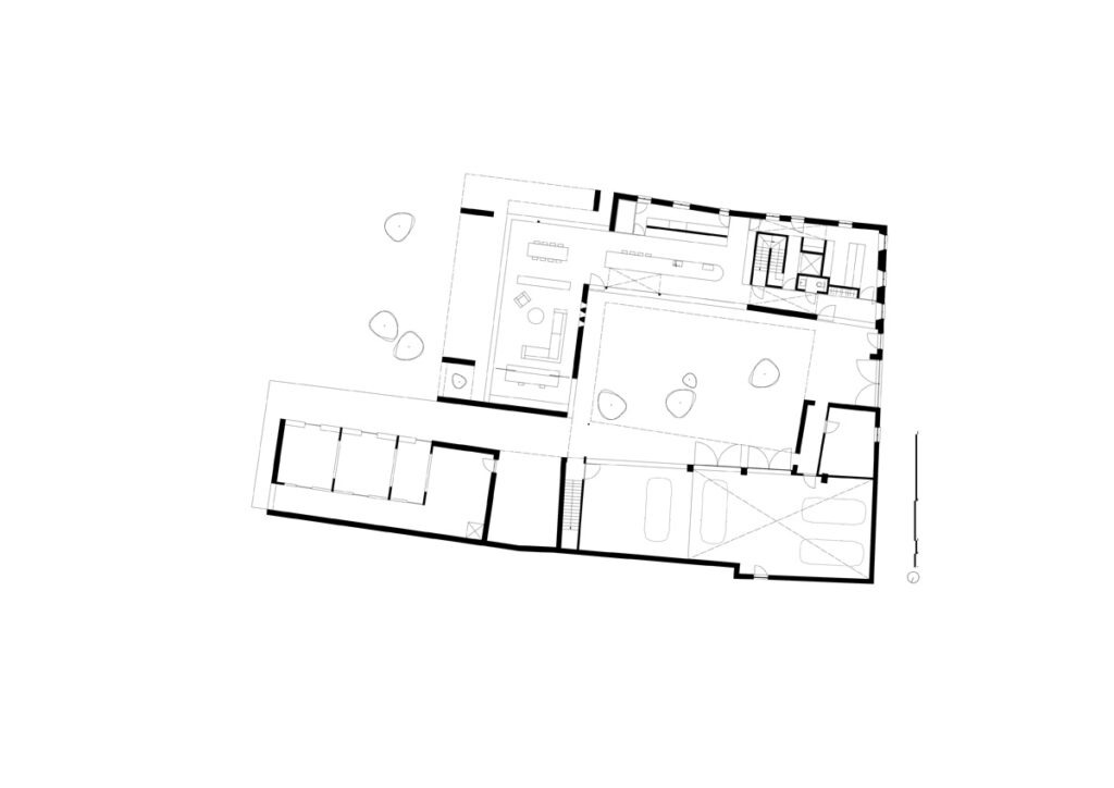 De schuur aan de linkerzijde van de hoeve is opengewerkt met een glazen wand. Ze fungeert als stallingsruimte voor de wagencollectie van de opdrachtgever. Vanuit de keuken is er over de binnenkoer zicht op deze collectie. Ook vanuit de fitnessruimte in het gebouwdeel is er zicht op de wagens.