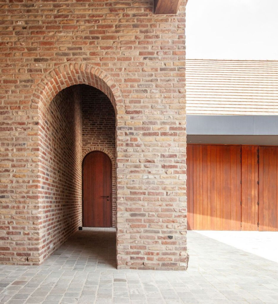 Een nieuwe deur naast de grote poort biedt bezoekers een gemakkelijke toegang tot de binnenkoer en de voordeur. Dat pad zorgt voor een zachte, geleidelijke overgang van de publieke naar de private sfeer. De uitwerking van deze secundaire toegang is verfijnd: daglicht accentueert de bakstenen wand onder de overdekte doorgang, de houten deur en poort verwijzen naar de houten spanten in de hoeve. Die bleven maximaal bewaard om de robuuste uitstraling intact te houden.
