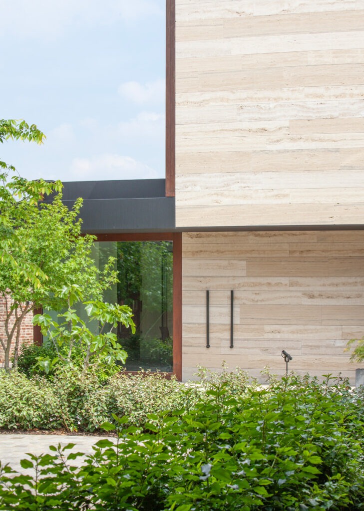 De uitbreiding aan de achterzijde van de hoeve met daarin de zitruimte en het thuiskantoor zijn in natuursteen uitgewerkt. Het gestyleerde volume verstopt zo niet dat het om een nieuwe toevoeging gaat. Tegelijkertijd is de materiaalkeuze respectvol voor de bestaande baksteenarchitectuur. Het houten schrijnwerk is een consequente rode draad tussen oud en nieuw. Het schrijnwerk is hier wel anders vorm gegeven dan in de glaswand aan de binnenkoer. Ze reiken tot op de hoeken van de gevels.