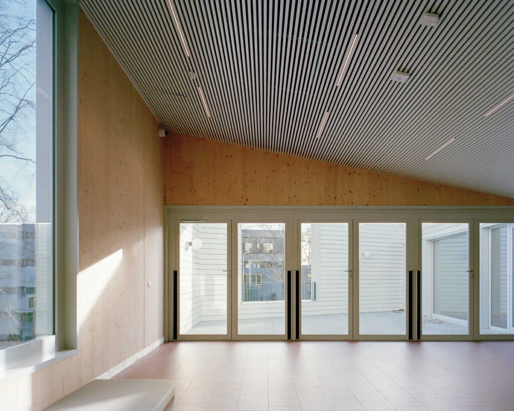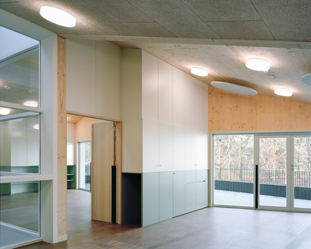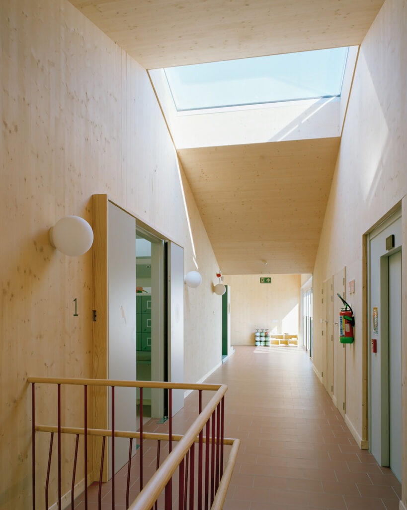 Het compacte gebouw bevat 8 leefgroepen verdeeld over 2 bouwlagen. Met heldere zoneringen, veel daglicht, fysieke en visuele connecties en met natuurlijke materialen wordt een warme werkomgeving voor het personeel en een prikkelende speelomgeving voor de kinderen gecreëerd. De houten draagstructuur is tastbaar in de ‘binnenstraten’ en polyvalente ruimtes waarlangs ouders en kinderen circuleren.