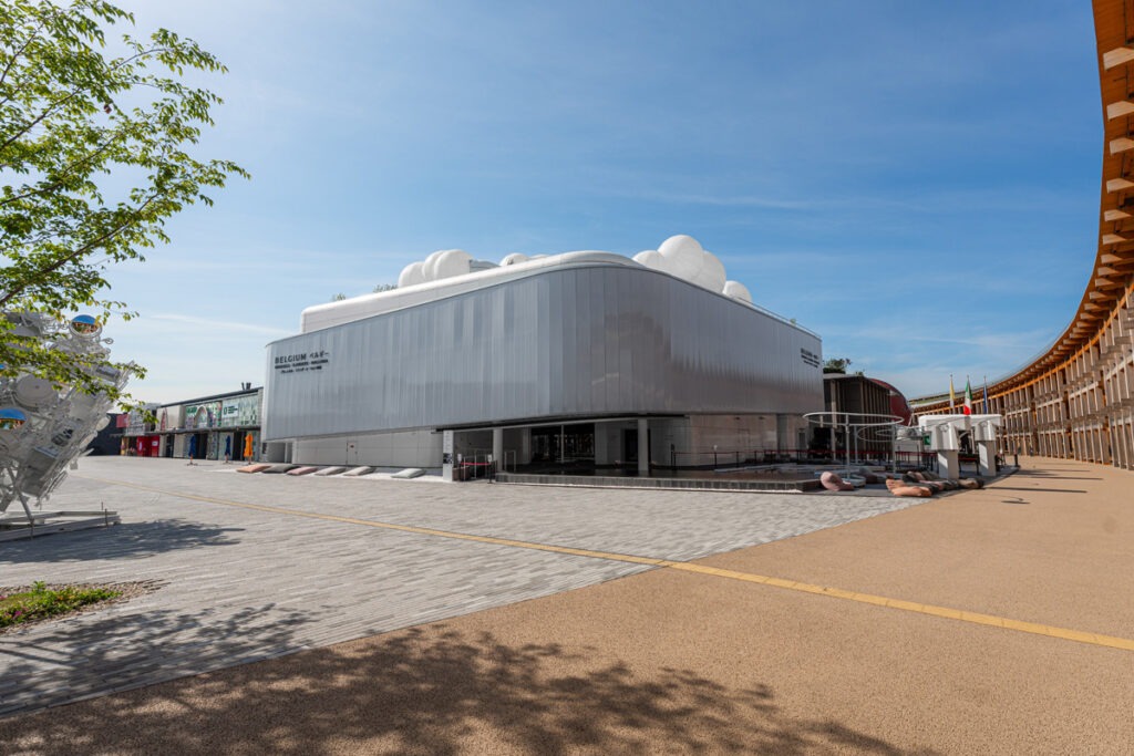 Le Pavillon belge décline le thème de l’eau à travers ses trois états — solide, liquide et gazeux. La structure principale, appelée « Ice Box », représente l’état solide de l’eau. Ce volume rappelle un glaçon cristallin. Il intègre un panneau holographique réalisé sur mesure rappelant la décomposition de la lumière dans l’eau.