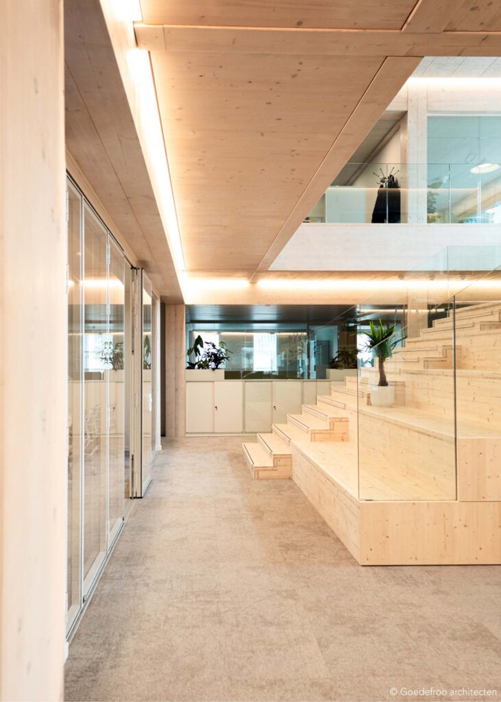 Daarnaast kozen we voor Kerto Ripa-vloeren, een hybride vloersysteem waarbij hout slim wordt gecombineerd met lichte materialen. In de ribbenvloeren zijn holtes voorzien, opgevuld met kiezels voor extra massa en minerale wol voor geluidsisolatie. Dit dempt vibraties aanzienlijk, zonder gewicht of bouwsnelheid in te boeten. Alle voorbereidingen gebeuren al in de prefabricatiefase: holtes en uitsparingen zijn vooraf geïntegreerd, zodat latere boringen die de structuur zouden verzwakken, overbodig zijn. Technieken verlopen onzichtbaar via een verhoogde computervloer, waardoor het gebouw zowel constructief performant als flexibel in gebruik is.