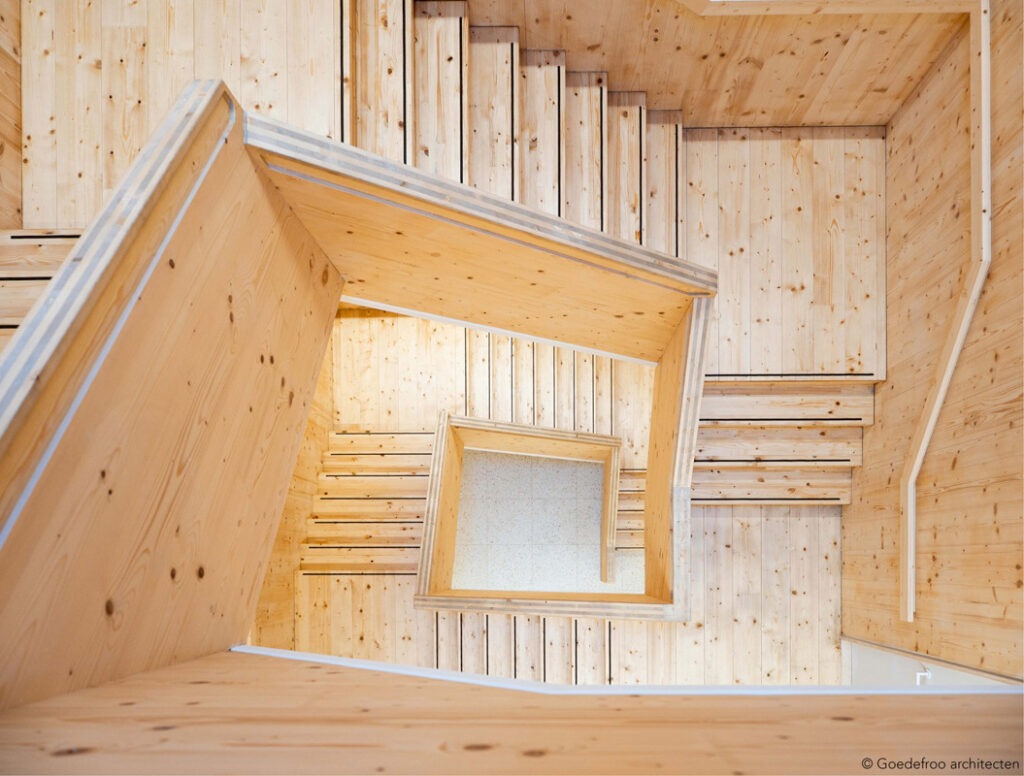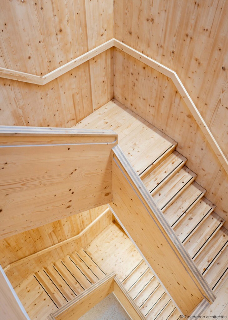 De draagstructuur, volledig in Cross-Laminated Timber (CLT), combineert ecologische prestaties, snelheid en kwaliteit. De zichtbare houtstructuur zorgt binnen voor warmte en comfort, terwijl prefabricatie de bouwtijd en impact beperkt. Deze bewuste keuzes resulteren in een helder en betaalbaar gebouw dat duurzaamheid, functionaliteit en esthetiek verenigt.
