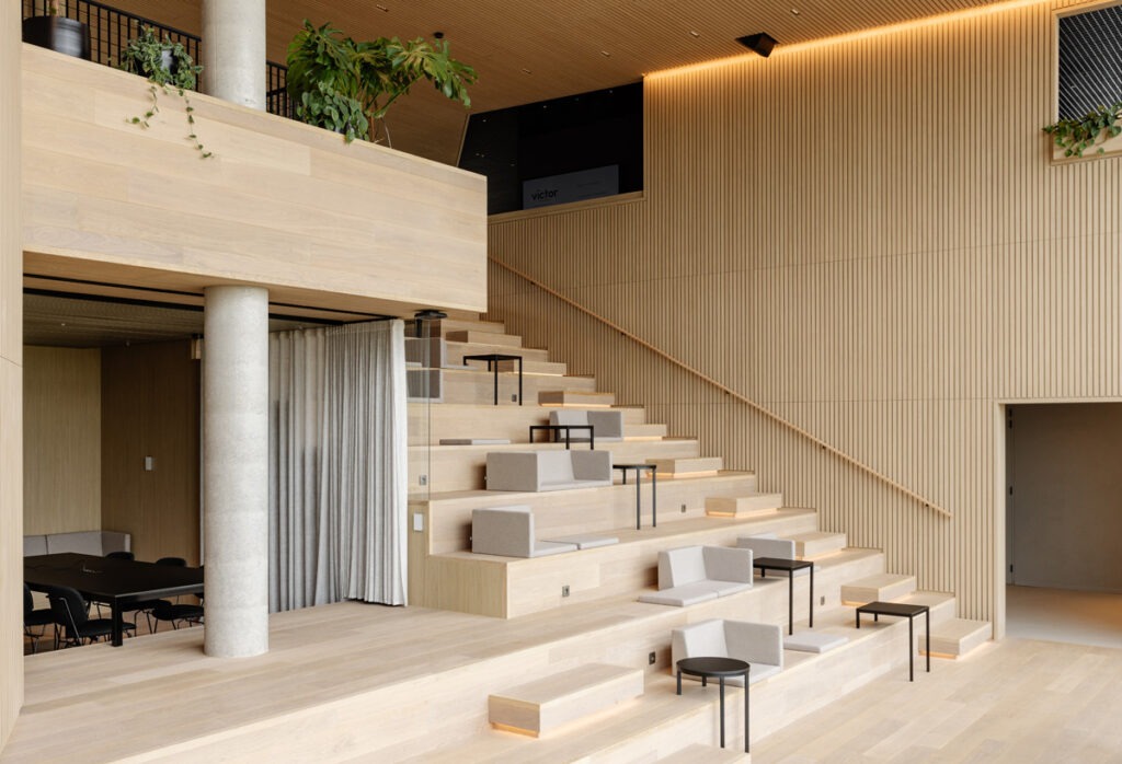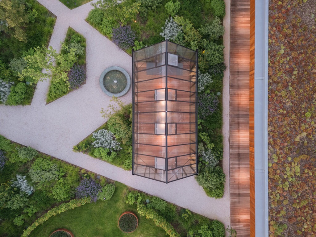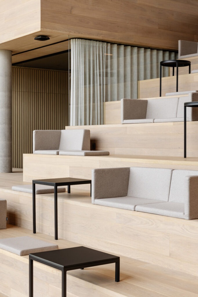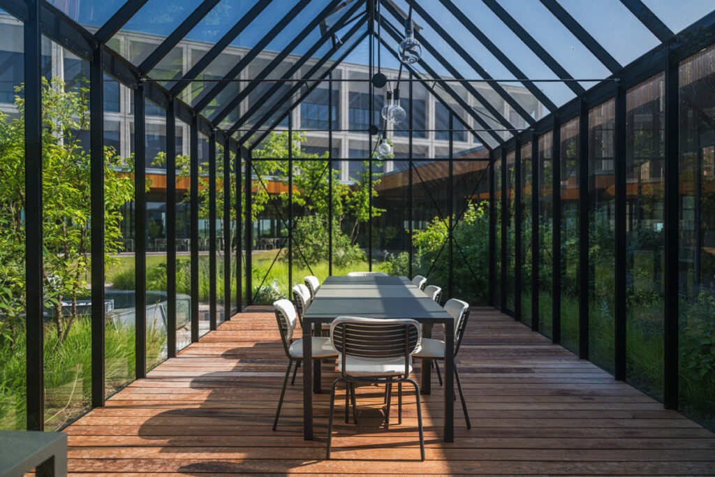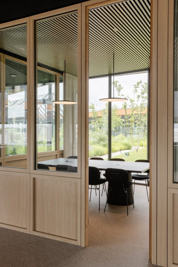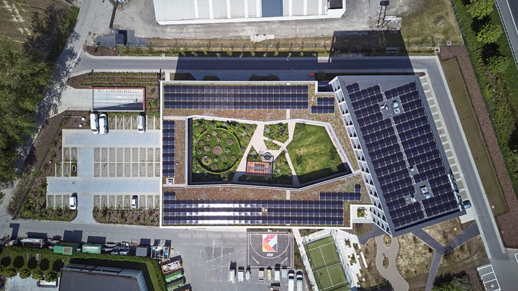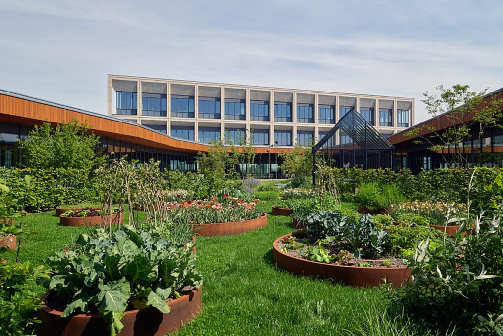 Duurzaamheid staat centraal: passiefhuisstandaard, geothermische warmtepompen, zonnepanelen, groendaken, waterrecuperatie en circulaire technieken zorgen voor een minimale ecologische voetafdruk. Het gebouw behaalde een WELL Gold-certificaat en richt zich volledig op het welzijn van gebruikers. Natuurlijke materialen, veel daglicht en akoestisch comfort scheppen een huiselijke sfeer.