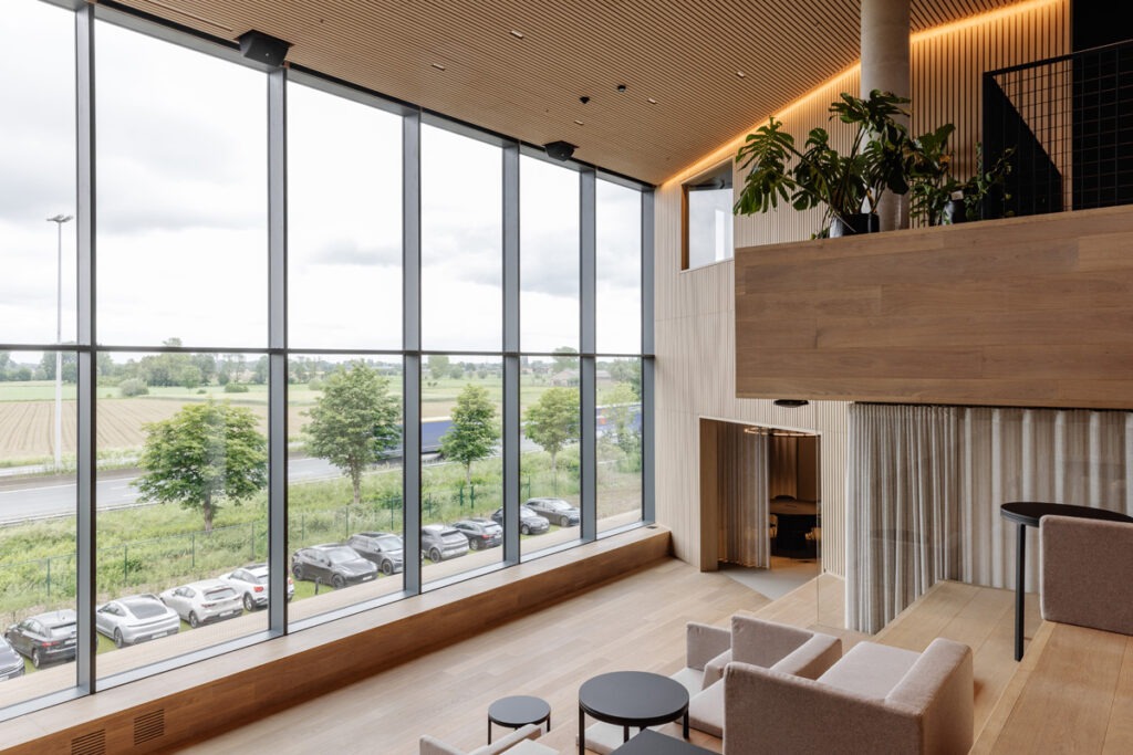 Er is gekozen voor kwalitatieve, warme en natuurlijke materialen met een hoge akoestische waarde die zorgen voor een huiselijke sfeer en bijdragen aan het welbehagen van de medewerkers waarbij integrale toegankelijkheid mee geïntegreerd werd. De daktuin en veel daglicht dragen bij aan een comfortabele en rustige sfeer.